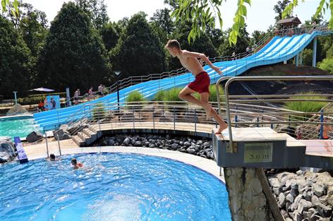 venkovní zážitkový bazén (33°C), venkovní termální bazén (36°C), vnitřní zážitkový bazén (32-34°C), vnitřní zážitkový bazén s termální vodou (34-36°C), vnitřní termální bazén (36-38°C)